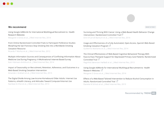"Kudos www.growkudos.com provides tools for researchers, publishers, and institutions to help increase the impact of published research. Through our integration with TrendMD, we have been able to drive additional traffic to publications, helping us increase the reach and impact for publications from a wide range of our publishers. We have found TrendMD to be responsive and they provided excellent technical integration support, making our integration very straightforward.”